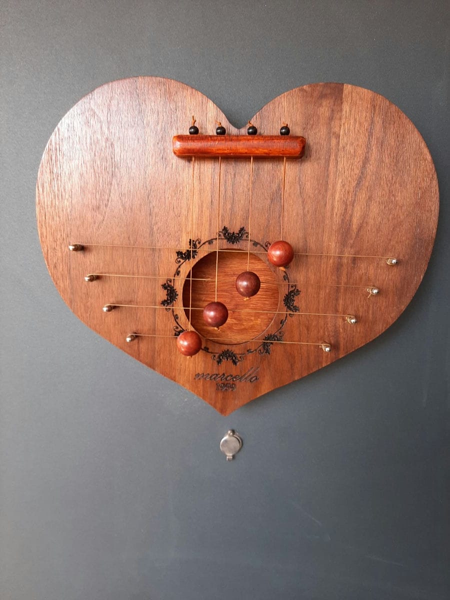 נבל דלת עשוי מעץ טבעי מלא ובחזית אגוז אמריקאי בעל תיבת תהודה ארבעה מיתרים וכדורי עץ