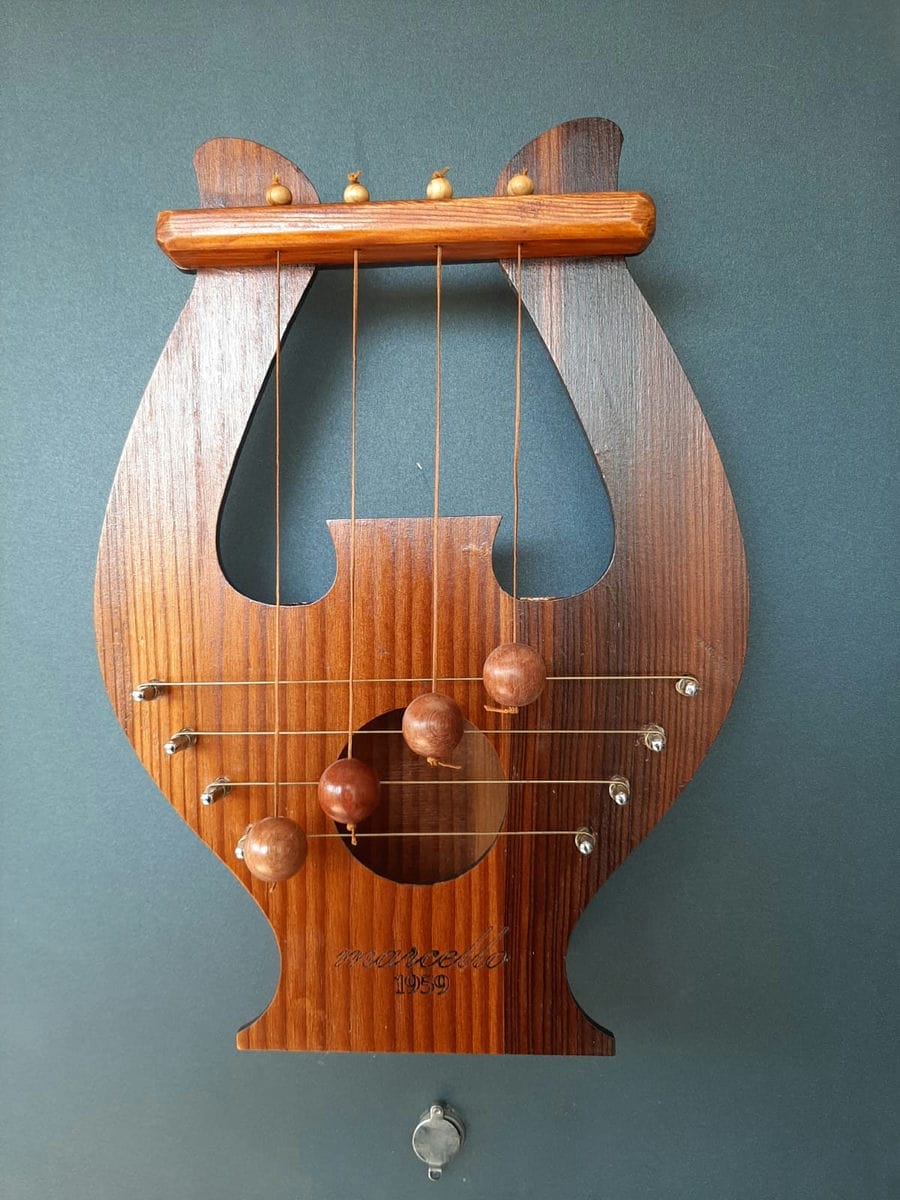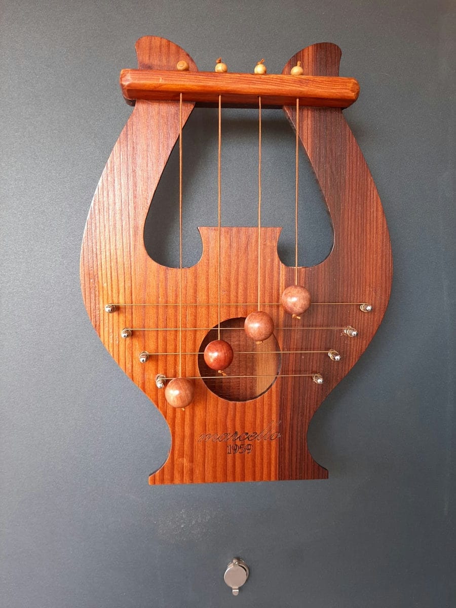 נבל לדלת עשוי מעץ מלא ואיכותי בעל תיבת תהודה מפוסל ככינור דוד ארבעה מייתרים וארבעה כדורי עץ